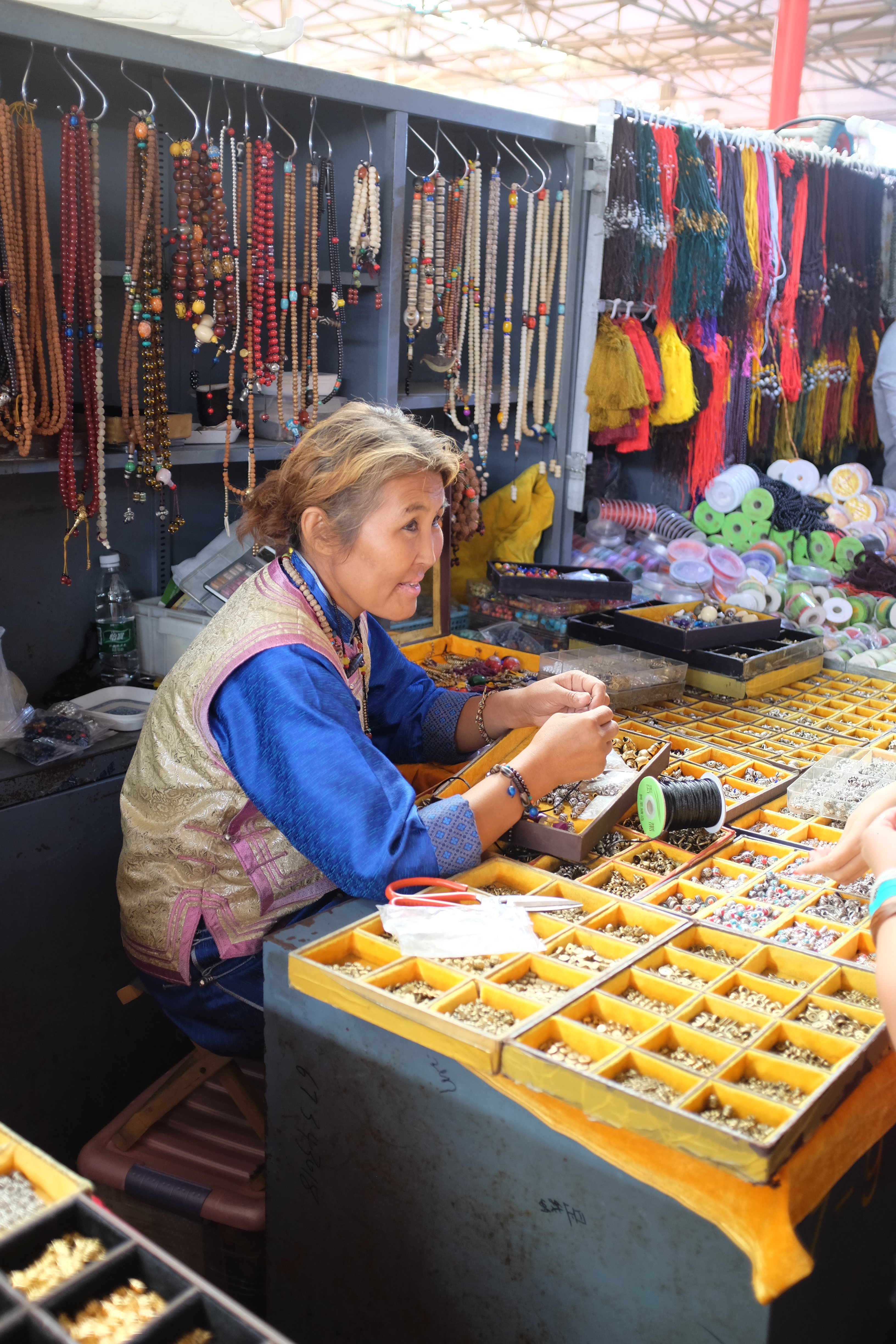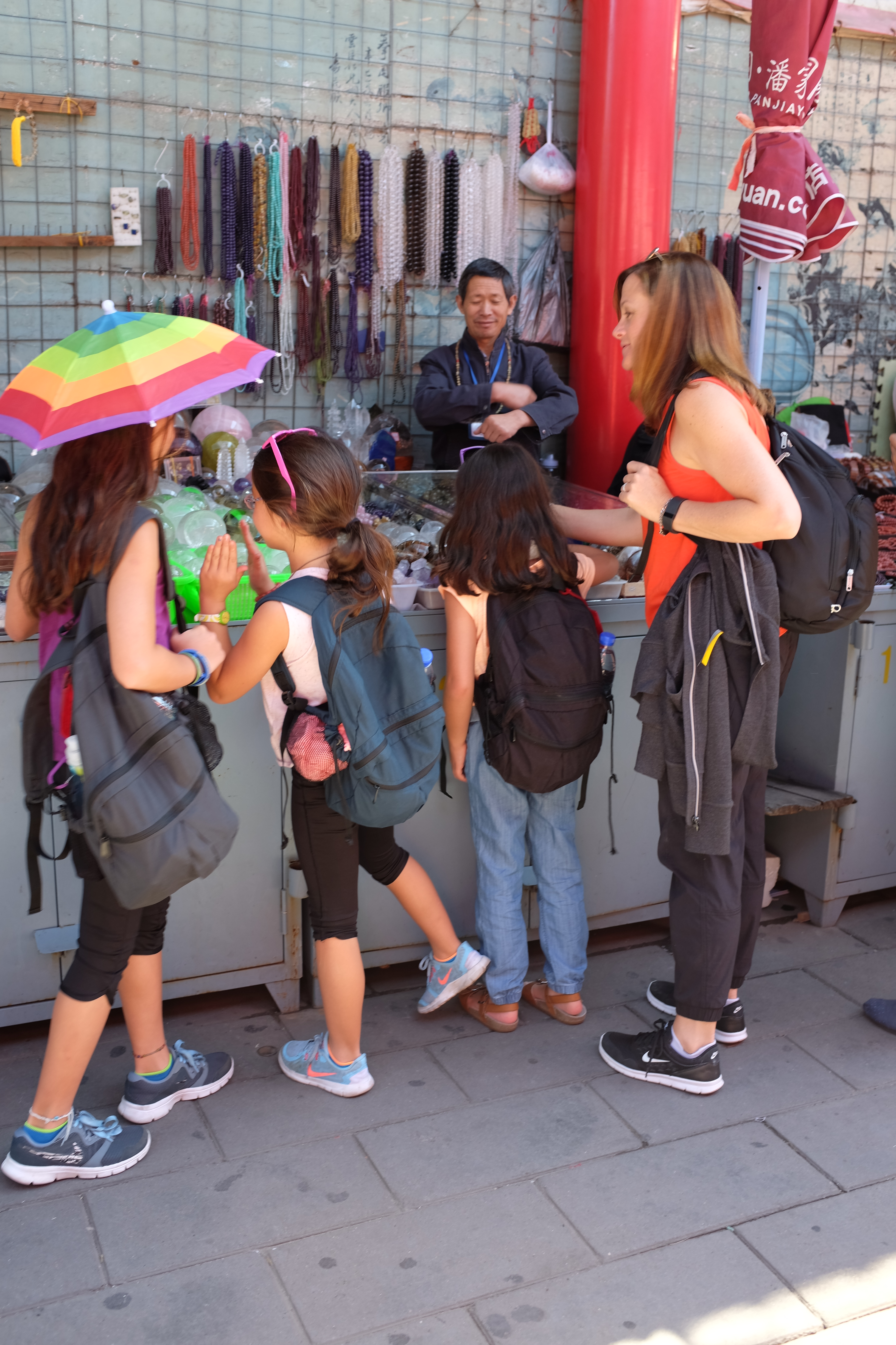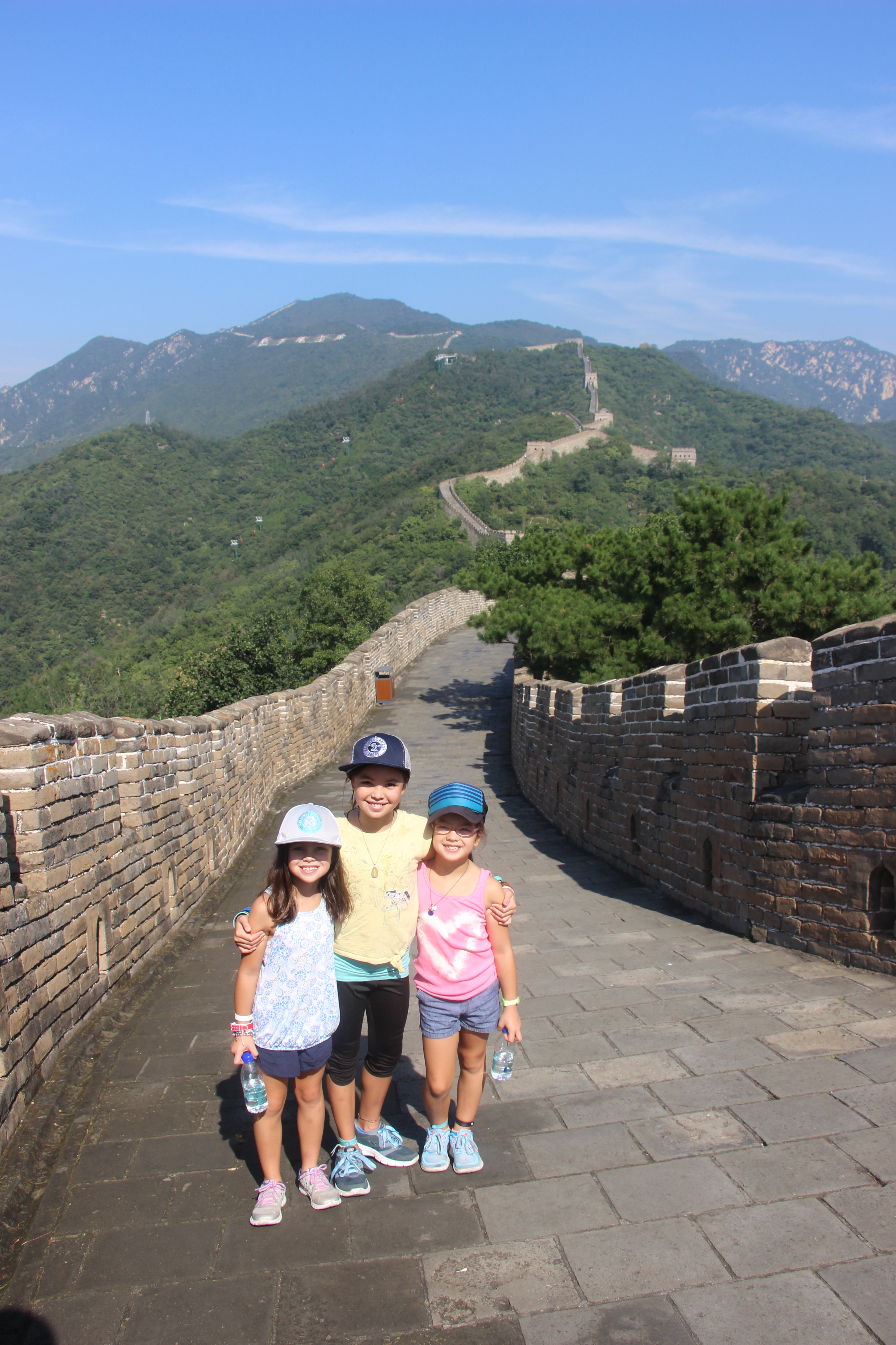 We decided not to just take a day trip from Beijing, but to spend a couple of nights at a place that someone recommended in the town of Mutianyu. I am so glad we did this. Driving almost two hours to and from the wall in one day would have been too much for all of us. Instead, we were able to walk from our cottage about 8 minutes up the road to get to the ski lifts which took us up to the Great Wall. Amazing! The views were phenomenal. The wall itself, stretched for miles either direction and looked like a snake on the ridge line. We were blown away. To think we were only seeing a small portion of the wall – it actually stretches a little over 13,000 miles east to west over China. The beginnings of the wall were started over 2,000 years ago! Just think of that!! We walked along the ancient wall for about an hour looking from tops of towers.